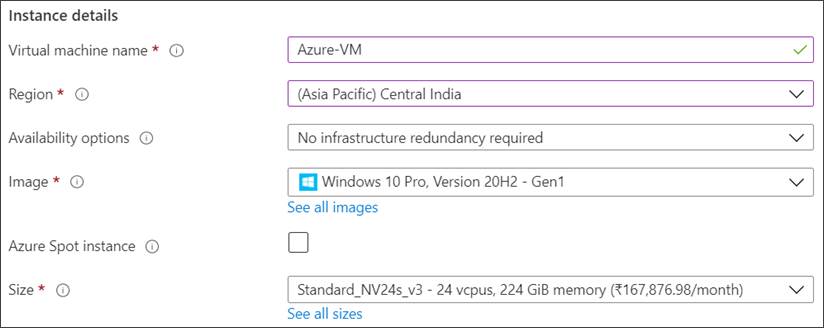 - Under Instance details, type Azure-VM (user choice) for the Virtual machine name and choose Central India for your Region. Choose Windows 10 pro, Version 20H2-Gen2 for the Image and Standard_NV24s_v3 for the Size (user choice). Leave the other defaults.