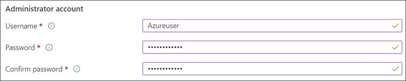 - Under Administrator account, provide a username, such as Azureuser and a password. The password must be at least 12 characters long and meet the defined complexity requirements.
