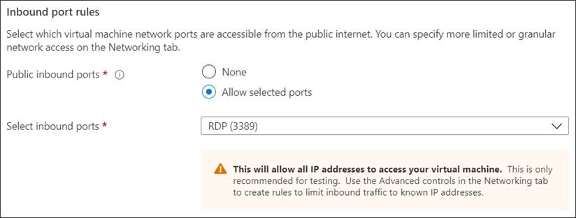 - Under Inbound port rules, choose Allow selected ports and then select RDP (3389) and HTTP (80) from the drop-down.