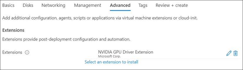 - In Advanced tab, under the Extensions click Select an extension to install, select NVIDIA GPU Driver Extension (user choice)