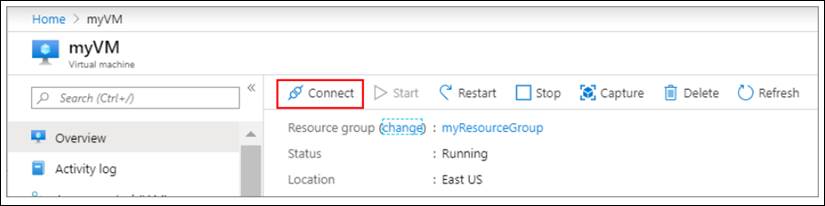 - On the overview page for your virtual machine, select the Connect button then select RDP.